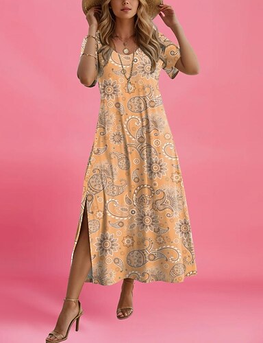 女性用 マキシドレス ペイズリードレス カジュアルドレス マキシドレス サンドレス エスニック トライバル風 バケーション ストリート 祝日 レギュラー ペーズリー 半袖 クルーネック ルビーレッド ブルー パープル オレンジ 夏