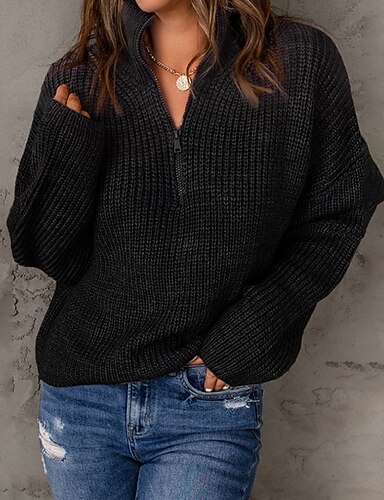 女性用 ニット プルオーバー ストリートファッション カジュアル 純色 シャツカラー ジッパー ニット 長袖 レギュラートップス ニット 日常 祝日 お出かけ ブラック ピンク 秋 冬