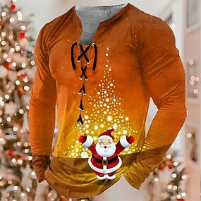 クリスマス メンズ クリスマス シーン ヘンリー T シャツ T シャツ ヘンリー T シャツ グラフィック サンタクロース ヘラジカ ヘンリー レッド ブルー オレンジ 3D プリント アウトドア 長袖 ボタンダウン プリント 衣類 アパレル デザイナー ベーシック クラシック