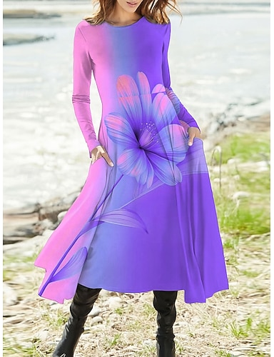 女性用 マキシドレス A ラインドレス フィット&フレアドレス 旅行度假风 カジュアル ボヘミアン パーティー 日常 お出かけ レギュラー オンブル' フラワー グラフィック 長袖 クルーネック ルビーレッド ブルー パープル 夏 春 秋 冬