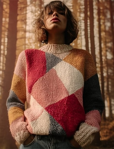 女性用 ニット プルオーバー 日常 カジュアル 幾何学模様 リブ クルーネック ニット プリント 長袖 レギュラートップス ニット アウトドア 週末 ピンク 秋 冬