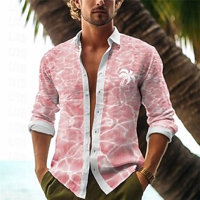 男性用 ヤシの木 熱帯植物 アロハシャツ プリントシャツ 長袖 シャツ 折襟 カジュアル デイリーウェア お出かけ 週末 ブラック ホワイト ピンク S M L