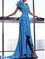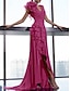 マーメイド/トランペットイブニングガウンエレガントプリーツドレスフォーマルサテンウエディングフロアレングスショートスリーブワンショルダーリスリット刺繍アップリケ