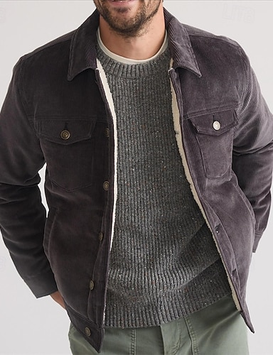 男性用 冬物ジャケット コーデュロイジャケット フリースの上着 カジュアルジャケット バケーション 日常 保温 ポケット フリース 冬 平織り ファッション ストリートファッション ラペル レギュラー カーキ色 アーミーグリーン コーヒー グレー ジャケット
