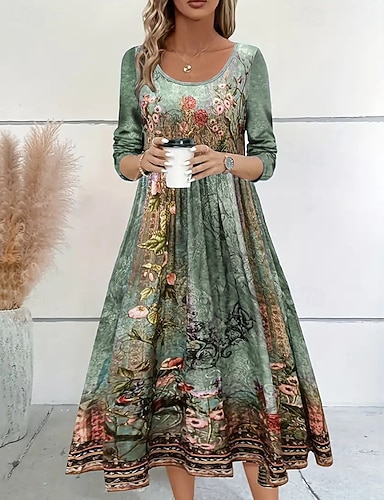 女性用 ミディドレス カジュアルドレス プリントドレス ヴィンテージ 近代の 日常 デート 週末 レギュラー フラワー 長袖 クルーネック ブルー グリーン ライトブルー 春 秋