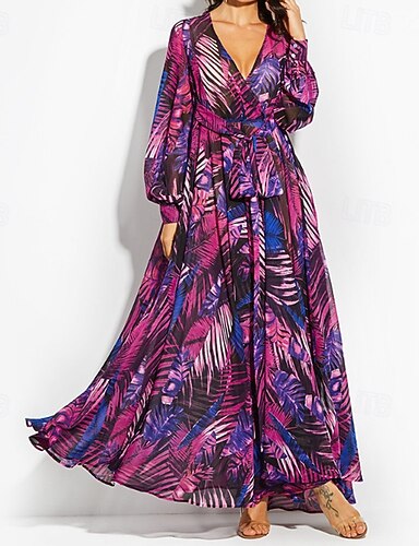 女性用 ミディドレス カジュアルドレス プリントドレス エレガント ファッション アウトドア パーティー 祝日 レギュラー フラワー 長袖 Vネック ピンク ブルー パープル 夏 春