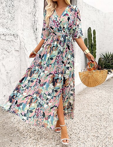 女性用 ロングドレス マキシドレス カジュアルドレス スイングドレス サマードレス エレガント ファッション ロマンチック アウトドア パーティー 祝日 レギュラー フラワー ハーフスリーブ Vネック ブルー カーキ色 夏