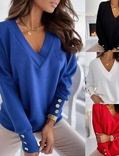 女性用 ニット プルオーバー ストリートファッション スタイリッシュ カジュアル 純色 Vネック ボタン ニット 長袖 レギュラートップス ニット 日常 祝日 お出かけ ブラック ホワイト 春 秋