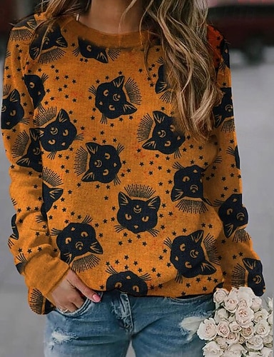 女性用 プルオーバースウェットシャツ スウェットシャツ 猫 カボチャ ストリートファッション カジュアル 長袖 クルーネック レギュラートップス ストリート 祝日 お出かけ プリント ブラック イエロー ダークグリーン オレンジ グリーン 秋 冬