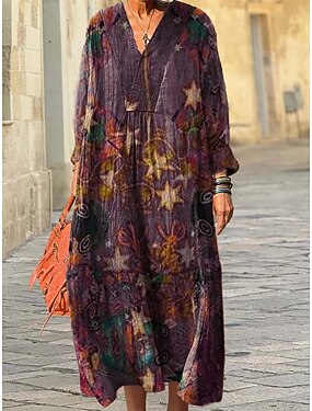 女性用 ミディドレス サンドレス A ラインドレス 旅行度假风 カジュアル ボヘミアン お出かけ ビーチ ルーズフィット グラフィック 幾何学模様 抽象的 長袖 Vネック ルビーレッド ブルー パープル グリーン 春 秋 冬