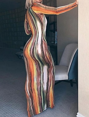 女性用 ロングドレス マキシドレス カジュアルドレス 自由奔放に生きるドレス ファッション 近代の アウトドア 祝日 デート レギュラー ストライプ 長袖 ディープVネック オレンジ グリーン グレー 夏 春