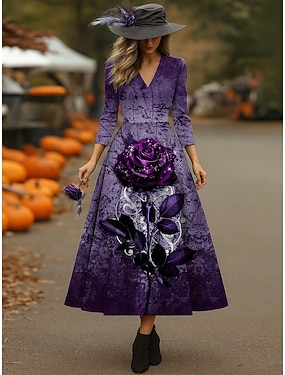 Halloween 女性用 ミディドレス A ラインドレス 旅行度假风 カジュアル 結婚式 パーティー 誕生日 レギュラー フラワー グラフィック ローズ 七分袖 Vネック イエロー ラスティ・レッド パープル 春 秋