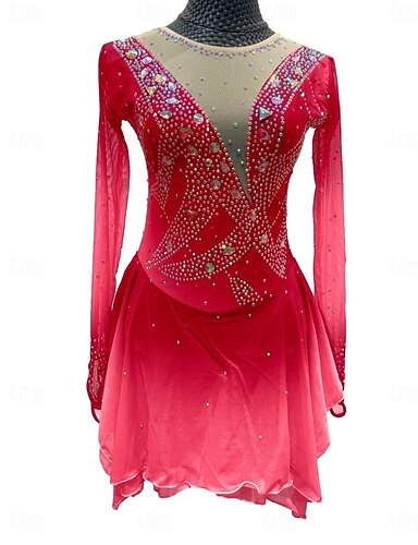 フィギュアスケート ドレス 女性用 女の子 アイススケート ドレス レッド パッチワーク ハロ染色 メッシュ スパンデックス 高弾性 訓練 レッスン用 プロフェッショナル スケートウェア クラシック クリスタル・ラインストーン 長袖 アイススケート フィギュアスケート