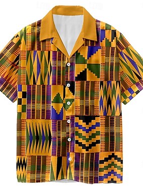 男性用 幾何学模様 エスニック アロハシャツ 半袖 シャツ 折襟 ハワイアン リゾート アウトドア バケーション ストリート イエロー ルビーレッド S M L