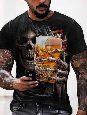 男性用 グラフィック スカル ビール Tシャツ ハロウィンシャツ 半袖 Tシャツ 3Dプリント クルーネック シャツ ヴィンテージ ファッション デザイナー アウトドア カジュアル 日常 ブラック 夏 衣類 S M L XL 2XL 3XL