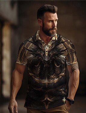 男性用 ドラゴン ポロシャツ ゴルフシャツ 半袖 ポロシャツ 襟付きシャツ カジュアル おかしい バケーションウェア パーティー衣装 ボタン 3Dプリント 夏 ブラック ダークグリーン