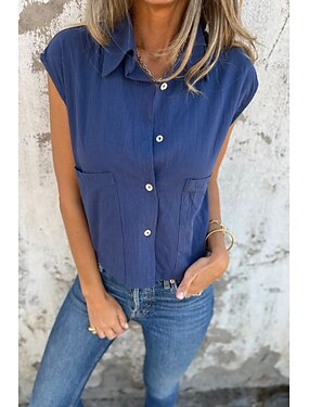 女性用 シャツ ボタンアップ ブラウス 平織り ベーシック 近代の カジュアル ノースリーブ シャツカラー レギュラートップス 日常 お出かけ ボタン ポケット ブラック ホワイト ライトブルー 夏