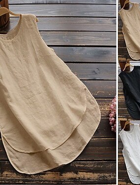 レディース コットンリネンベスト 無地 ベーシック カジュアル 半袖 クルーネック レギュラートップス デイリー お出かけ アシンメトリーヘム ブラック ホワイト カーキ 夏