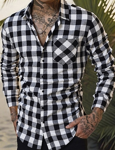 男性用 シャツ サマーシャツ カジュアルシャツ ビーチシャツ ボタンアップシャツ ブラック ブルー グリーン 長袖 チェック ラペル バケーション ハワイアン ポケット 衣類 ポリエステル ファッション カジュアル 快適