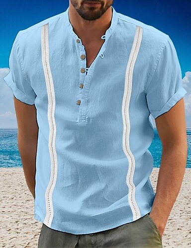 男性用 シャツ サマーシャツ カジュアルシャツ ビーチシャツ ボタンアップシャツ ライトブルー 半袖 縞 グランダッドカラー ラペル バケーション ハワイアン 衣類 ファッション カジュアル 快適