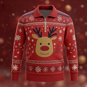 クリスマス 男性用 カートゥン トナカイ スノーフレーク柄 ポロ 長袖 折襟 近代の レジャー カジュアル/普段着 ジッパー 3Dプリント 春 秋 冬 ルビーレッド パープル