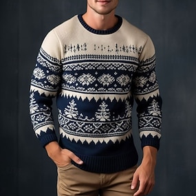 醜いクリスマスセーター メンズ プリントセーター スノーフレークプリント 編み物 プルオーバー ジャンパー ニットウェア 大晦日セーター アウトドア 日常 休暇 長袖 クルーネック ネイビーブルー 青 ダークブルー 秋 冬