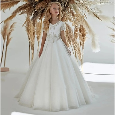フラワーガールドレス キッズ 女の子 レースドレス フォーマルドレス プリンセスドレス 初聖体拝領ドレス 性能 結婚式 パーティー エレガント 美しい メッシュ 純色 ハーフスリーブ オフショルダー ホワイト 4年以上