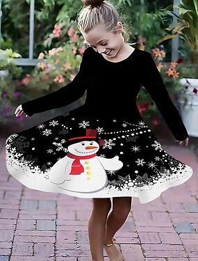 女子 3D 雪だるま スノーフレーク柄 ドレス 長袖 夏 春 バケーション 日常 祝日 プリンセス 美しい 甘い 子供 4〜12年 カジュアルドレス A ラインドレス 膝丈 レギュラー