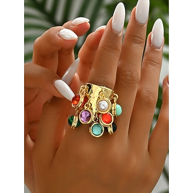 カラフルなチャームが付いた女性用ゴールドチャンキーリング - パーティーやフェスティバルにぴったりのボヘミアンステートメントカクテルジュエリー