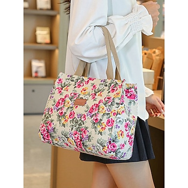 女性用 トートバッグ ショルダーバッグ キャンバス ショッピング カジュアル カジュアル/普段着 ジッパー 大容量 折り畳み式 フラワー ブラック ホワイト ピンク