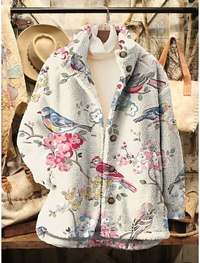 女性用 フリースの上着 カジュアルジャケット 快適 高通気性 ポケット プリント カジュアル フラワー バケーション ストリート カジュアル デイリーウェア ジッパ- レギュラー 折襟 ルーズフィット 長袖 アウターウェア ブラック ピンク ブルー 春 秋