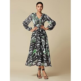 レディースミディドレス ブラウン 花柄 レーヨンシャツ ラグランスリーブ 調節可能な伸縮性ウエストバンド 快適なフィット感 カジュアル デイリー 春 夏 秋