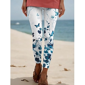 女性用 パンツ レギンス ストリートファッション カジュアル 全長 ハイウエスト フラワー 弾性ウエスト プリント 通気性 快適 伸縮性あり バケーション ストリート デイリーウェア ブルー 夏 春 秋 レギュラー