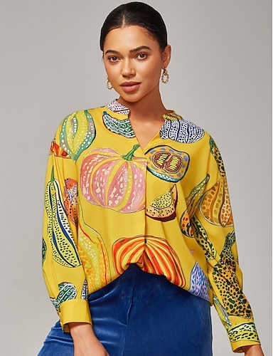 レディーストップス カジュアル ドロップショルダー スタンドカラー インバーテッドプリーツ パンプキンプリント イエロー