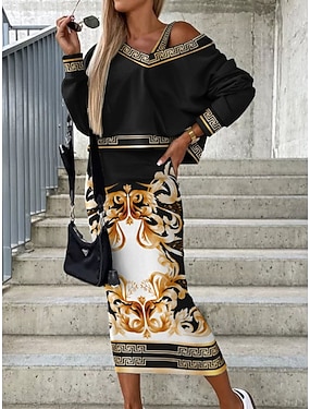 女性用 ドレスセット カジュアルドレス スカートセット シースドレス ファッション ストリートファッション フラワー 幾何学模様 プリント ミディドレス 長袖 Vネック アウトドア バケーション ブラック ホワイト イエロー 秋 冬 ルーズフィット