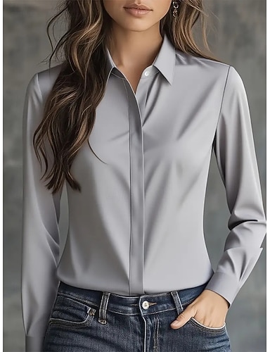 女性用 Elegant ドレッシー サテン ブラウス 平織り エレガント 日常 スタイリッシュ 長袖 Vネック レギュラートップス ブラック ホワイト グレー 秋
