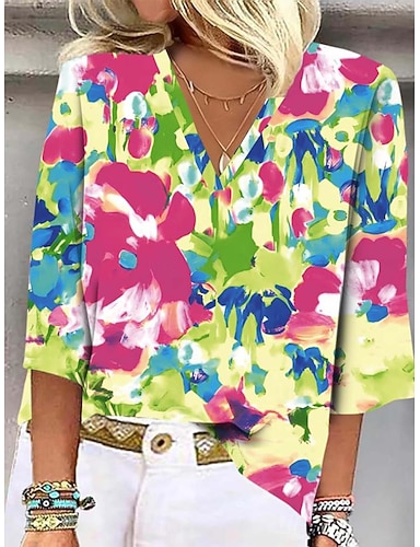 女性用 シャツ フラワー 日常 スタイリッシュ ベーシック ハーフスリーブ Vネック レギュラートップス 日常 祝日 プリント ピンク ルビーレッド グリーン 春 秋