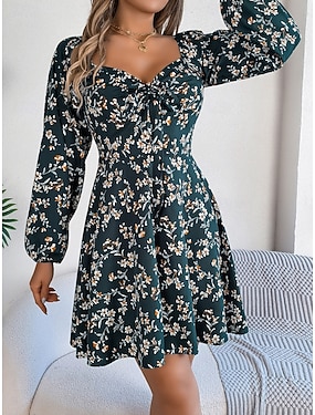 女性用 ミニドレス カジュアルドレス A ラインドレス スタイリッシュ カジュアル バケーション 日常 レギュラー フラワー 長袖 スクエアネック ダークグリーン 春 秋