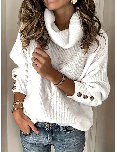 女性用 ニット エレガント ヴィンテージ 日常 純色 タートルネック ボタン 長袖 レギュラートップス ニット 日常 ダークブルー ベージュ 秋 冬