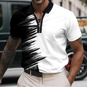 男性用 幾何学的な ライン ジップポロシャツ 半袖 ポロシャツ 襟付きシャツ ビジネスカジュアル ビジネス アスレイジャー 仕事に着る デイリーウェア 3Dプリント 夏 ブラック