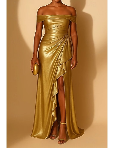 Aライン タイト/コラム イブニングドレス エレガント フォーマルドレス フォーマル 結婚式 スイープ/ブラシトレーン ノースリーブ オフショルダー ルレックス生地 とともに ラッフル スリット 2025