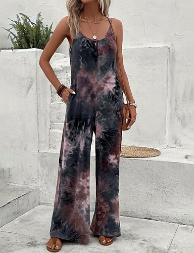 女性用 標準 ジャンプスーツ カジュアル タイダイ ノースリーブ ワイドレッグ クルーネック ポケット プリント ストリート 日常 レギュラー ブラック ピンク ネイビーブルー 夏