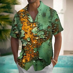 男性用 ビンテージ ダメージ加工のラストプリント シャツ サマーシャツ ボタンアップシャツ 半袖 ヴィンテージレトロ アウトドア バケーション 日常着 夏 春 折襟 3Dプリント 襟付きシャツ フロントポケット1つ グリーン