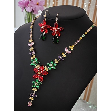 女性用のカラフルなクリスタルネックレスとイヤリングセット、クリスマスパーティーに最適なエレガントな花柄ステートメントジュエリー &カクテルイベント