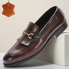 メンズダークブラウンレザータッセルローファー - オフィス、ビジネスミーティング、普段使いに最適なクラシックなスリッポンタイプの牛革ドレスシューズ