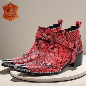 メンズの赤い蛇柄レザーアンクルブーツ、メタルトゥとバックルストラップ付き。ライダー、バイカースタイル、パーティーウェアに最適なロックパンクウエスタンカウボーイブーツ。