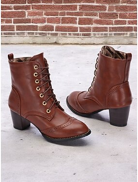 ミドルヒールのブラウンのレースアップビクトリアンブーツ。カジュアルウェア、アウトドア活動、週末のお出かけに最適です。