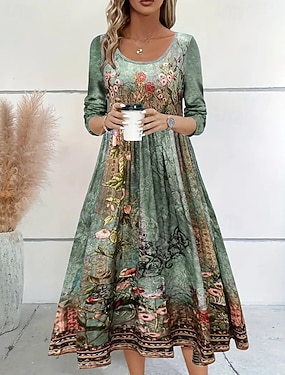 女性用 ミディドレス カジュアルドレス プリントドレス ヴィンテージ 近代の 日常 デート 週末 レギュラー フラワー 長袖 クルーネック ブルー グリーン ライトブルー 春 秋