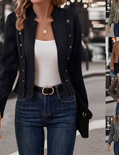 女性用 ブレザー 快適 高通気性 ボタン ファッション 近代の 平織り ワーク 日常 レギュラー スタンド レギュラー 長袖 アウターウェア ブラック ホワイト グレー 秋 冬