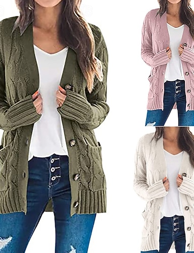 女性用 カーディガン カジュアル ソフト 純色 ケーブル Vネック ボタン ニット 長袖 レギュラートップス ニット アウトドア 祝日 週末 ピンク アーミーグリーン 秋